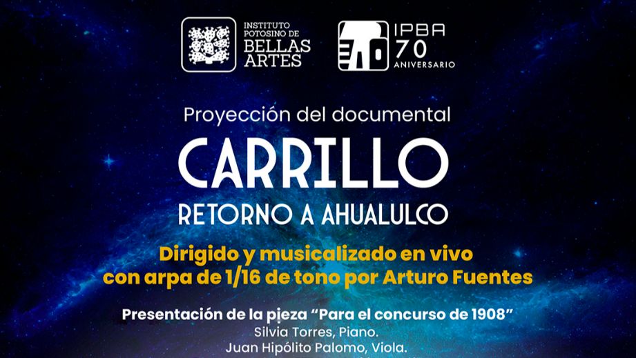 La Secretaría de Cultura de Gobierno del Estado, en el marco del 150 aniversario de natalicio de Julián Carrillo, invita al público en general a la proyección del documental Carrillo - Retorno a Ahualulco, que contará con musicalización en vivo con arpa de 1/16 de tono por Arturo Fuentes, director de la pieza cinematográfica, y que se llevará a cabo este jueves 30 de enero a las 19:30 h, en el Centro de Difusión Cultural del Instituto Potosino de Bellas Artes, con entrada libre.
